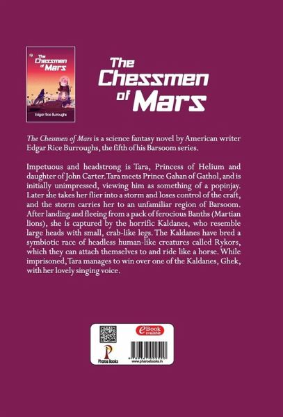 The Chessmen of Mars is a science fantasy novel by American writer Edgar Rice Burroughs, the fifth of his Barsoom series. Impetuous and headstrong is Tara, Princess of Helium and daughter of John Carter. Tara meets Prince Gahan of Gathol, and is initially unimpressed, viewing him as something of a popinjay. Later she takes her flier into a storm and loses control of the craft, and the storm carries her to an unfamiliar region of Barsoom. After landing and fleeing from a pack of ferocious Banths (Martian lions), she is captured by the horrific Kaldanes, who resemble large heads with small, crab-like legs. The Kaldanes have bred a symbiotic race of headless human-like creatures called Rykors, which they can attach themselves to and ride like a horse. While imprisoned, Tara manages to win over one of the Kaldanes, Ghek, with her lovely singing voice.