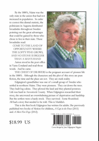 THE CHEST OF DRAWERS is the poignant account of pioneer life in the 1880's. Although the characters and the plot of this story are pure fiction, the time and the place are not. They are stark reality. Edgington's grandfather was one of a small group of Swedes who settled in northern Maine. They were pioneers. They cut down the trees. They built log cabins. They plowed the land and they planted potatoes. Life was hard in Aroostook County. When Edgington researched their story, she uncovered an overwhelming picture of deprivation and hardship. But the settlers were a hardy stock. They survived. Some flourished. All had a story that needed to be told. This is Matilda's.