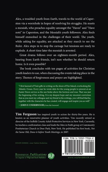 Alex, a troubled youth from Earth, travels to the world of Caperston via a wormhole in hopes of resolving his struggles. He meets a messiah, who preaches equality amongst the ""Haves"" and ""Have nots"" in Caperston, and his youth followers. Alex finds himself enmeshed in the challenges of their world. The youth, while asking for equality, are attacked as they march to see the Ruler. Alex steps in to stop the carnage but tensions are ready to explode. A short time later the messiah is arrested. Great drama follows over an eighteen-month period. Alex, hearing from Earth friends, isn't sure whether he should return home. Is it even possible? The book concludes with ten pages of activities for Christian youth leaders to use, when discussing the events taking place in the story. Themes of forgiveness and prayer are highlighted.