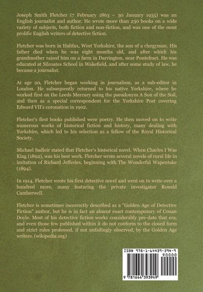 Joseph Smith Fletcher (7 February 1863 - 30 January 1935) was an English journalist and author. He wrote more than 230 books on a wide variety of subjects, both fiction and non-fiction, and was one of the most prolific English writers of detective fiction. Fletcher was born in Halifax, West Yorkshire, the son of a clergyman. His father died when he was eight months old, and after which his grandmother raised him on a farm in Darrington, near Pontefract. He was educated at Silcoates School in Wakefield, and after some study of law, he became a journalist. At age 20, Fletcher began working in journalism, as a sub-editor in London. He subsequently returned to his native Yorkshire, where he worked first on the Leeds Mercury using the pseudonym A Son of the Soil, and then as a special correspondent for the Yorkshire Post covering Edward VII's coronation in 1902. Fletcher's first books published were poetry. He then moved on to write numerous works of historical fiction and history, many dealing with Yorkshire, which led to his selection as a fellow of the Royal Historical Society. Michael Sadleir stated that Fletcher's historical novel, When Charles I Was King (1892), was his best work. Fletcher wrote several novels of rural life in imitation of Richard Jefferies, beginning with The Wonderful Wapentake (1894). In 1914, Fletcher wrote his first detective novel and went on to write over a hundred more, many featuring the private investigator Ronald Camberwell. Fletcher is sometimes incorrectly described as a "Golden Age of Detective Fiction" author, but he is in fact an almost exact contemporary of Conan Doyle. Most of his detective fiction works considerably pre-date that era, and even those few published within it do not conform to the closed form and strict rules professed, if not unfailingly observed, by the Golden Age writers. (wikipedia.org)