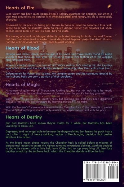 Hearts of Fire Luca Duray has been quite happy living a solitary existence for decades. But when a steel trap around his leg catches him when he's weak and hungry, his life is irrevocably changed. Disowned by his pack for being gay, Tanner McBane is forced to become a lone wolf. While on a hunt, he stumbles upon an injured dragon shifter and provides aid. Soon, Tanner learns Luca isn't just his boss-he's his mate. The mating of a wolf and dragon shifter is uncharted territory for both Luca and Tanner, but they are determined to make it work despite widespread prejudice, death threats, and the untraditional pack Tanner finds himself leading. Hearts of Blood Omega wolf shifter, Vance, and the rest of his small pack have finally found an Alpha willing to take them on and were still trying to regain their footing when the McBane Pack attacked them. When a vampire appears in front of him, Vance realizes he's looking into the ice-blue eyes of his mate, and the fact that his mate is something other than wolf scares him. Unfortunately for Vance and Sakima, the vampire coven and the continued attacks by the McBane Pack are only a portion of their problems. Hearts of Magic A moment of quiet was all Theran was looking for. He was not looking to be nearly decimated when he stumbled across a sorcerer near the pack's hunting grounds. Colby hides his paranormal identity well, but learning the wolf he's been dreaming about is real is only compounded by learning the wolf is his mate. With the Sorcerer's Enclave now interested in the Chevalier Pack, Colby attempts to protect Theran by kidnapping him, which only results in a deeper involvement with the pack. Hearts of Destiny Ean and Matthias have known they're mates for a while, but Matthias has been unwilling to claim Ean. Depressed and no longer able to be near the dragon-shifter, Ean leaves the pack house and, after a night of heavy drinking, makes a life-changing decision that pushes Matthias into action. As the blood moon draws nearer, the Chevalier Pack is called before a tribunal of paranormal leaders to assess the Alpha's rumored mysterious abilities. Matthias decides to share his secrets with a little help from Colby. And to top everything off, they face another attack by the McBane Pack, which the Chevalier decide will be the last.