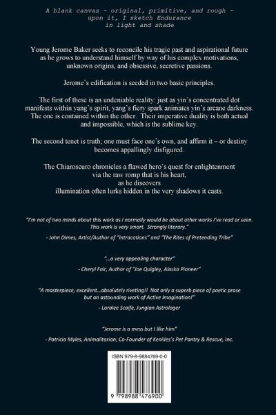 Young Jerome Baker seeks to reconcile his tragic past and aspirational future, as he grows to understand himself by way of his complex motivations, unknown origins, and obsessive, secretive passions. Jerome's edification is seeded in two basic principles. The first of these is an undeniable reality: just as yin's concentrated dot manifests within yang's spirit, yang's fiery spark animates yin's arcane darkness. The one is contained within the other. Their imperative duality is both actual and impossible, which is the sublime key. The second tenet is truth; one must face one's own, and affirm it - or destiny becomes appallingly disfigured. The Chiaroscuro chronicles a flawed hero's quest for enlightenment via the raw romp that is his heart, as he discovers illumination often lurks hidden in the very shadows it casts.