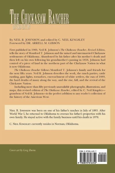 First published in 1960, Neil R. Johnson's The Chickasaw Rancher, Revised Edition, tells the story of Montford T. Johnson and the first white settlement of Oklahoma. Abandoned by his father after his mother's death and then left on his own following his grandmother's passing in 1868, Johnson became the owner of a piece of land in the northern part of the Chickasaw Nation in what is now Oklahoma. The Chickasaw Rancher follows Montford T. Johnson's family and friends for the next thirty-two years. Neil R. Johnson describes the work, the ranch parties, cattle rustling, gun fights, tornadoes, the run of 1889, the hard deaths of many along the way, and the rise, fall, and revival of the Chickasaw Nation. This revised edition of The Chickasaw Rancher, edited by C. Neil Kingsley, Neil R. Johnson's grandson, is the perfect addition to any reader's collection of the history of the American West.