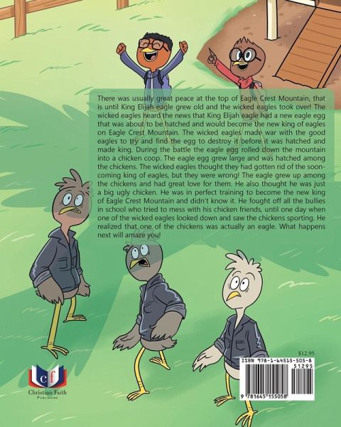 There was usually great peace at the top of Eagle Crest Mountain, that is until King Elijah eagle grew old and the wicked eagles took over! The wicked eagles heard the news that King Elijah eagle had a new eagle egg that was about to be hatched and would become the new king of eagles on Eagle Crest Mountain. The wicked eagles made war with the good eagles to try and find the egg to destroy it before it was hatched and made king. During the battle the eagle egg rolled down the mountain into a chicken coop. The eagle egg grew large and was hatched among the chickens. The wicked eagles thought they had gotten rid of the soon-coming king of eagles, but they were wrong! The eagle grew up among the chickens and had great love for them. He also thought he was just a big ugly chicken. He was in perfect training to become the new king of Eagle Crest Mountain and didn't know it. He fought off all the bullies in school who tried to mess with his chicken friends, until one day when one of the wicked eagles looked down and saw the chickens sporting. He realized that one of the chickens was actually an eagle. What happens next will amaze you!