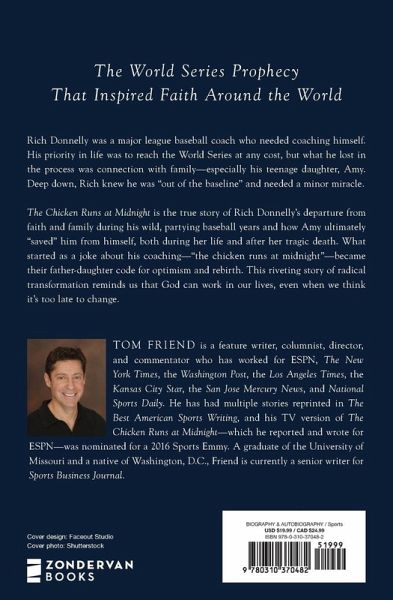 Discover the nearly unbelievable true story of how a goofy catchphrase spoken by a coach's dying daughter inspired the 1992 Pittsburgh Pirates in game seven of the National League Championship Series and later became a sign from heaven to a grieving family at the end of game seven of the 1997 World Series. As a Major League Baseball coach, Rich Donnelly was dedicated, hardworking, and successful. But as a husband and father, he was distant, absent, and a failure. He'd let baseball take over his life, and as a result, his family suffered--that is, until the day he received some harrowing news. "Dad, I have a brain tumor, and I'm sorry." These words from his seventeen-year-old daughter, Amy, turned his world upside down. Now, more than ever, he was determined to put his family first. The time they spent together in the months before Amy's death were moments that Rich and his family will treasure forever, but they'll especially remember the inside joke that became a catchphrase for not only the Donnelly family but also the Pittsburgh Pirates as they played in the National League Championship Series that year: "The chicken runs at midnight." This book shares the heartwarming story behind the odd catchphrase--and how it still lives on as a symbol for never giving up--and proves that God can work in any person's life, even despite their mistakes and failures. As you learn more about Amy's incredible story, you'll discover: * The life-changing power of forgiveness * How to find peace and joy in the midst of loss * The gift of God's grace Weaving baseball history with personal memoir, this book is one that will make you thrill to victory, believe in hope, and stand up to cheer for what is good in people's lives. It reminds us that God can work in our lives even when we think it's too late to change--and sometimes he sends us signs from heaven, if we only have eyes to see. Praise for The Chicken Runs at Midnight: "The Chicken Runs at Midnight is a beautiful story of baseball, family, and faith. Tom Friend does a wonderful job of weaving these three themes together and telling you a story that will give you the chills. You will cry; you will laugh; and you will tell the story over and over again--just as I have." --Craig Counsell, manager of the Milwaukee Brewers "The Chicken Runs at Midnight is the kind of heartwarming story all of us need, not just baseball fans. In our loud, busy world, it's a poignant reminder of what is truly important." --Tom Verducci, bestselling author of The Yankee Years and The Cubs Way