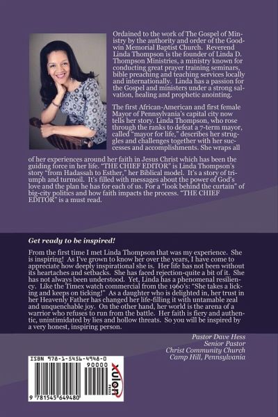 The first African-American and first female Mayor of Pennsylvania's capital city now tells her story. Linda Thompson, who rose through the ranks to defeat a 7-term mayor, called "mayor for life," describes her struggles and challenges together with her successes and accomplishments. She wraps all of her experiences around her faith in Jesus Christ which has been the guiding force in her life. The Chief Editor is Linda Thompson's story "from Hadassah to Esther," her Biblical model. It's a story of triumph and turmoil. It's filled with messages about the power of God's love and the plan he has for each of us. For a "look behind the curtain" of big-city politics and how faith impacts the process. "The Chief Editor" is a must read.