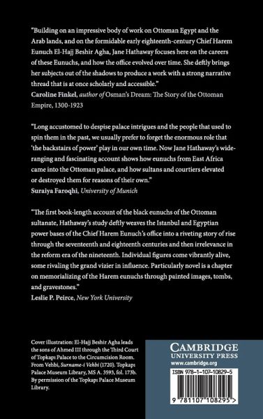 1. Introduction to the Chief Harem Eunuch 2. The African Connection 3. Arrangement in black and white: eunuchs in the Ottoman Palace 4. The creation of the office of Chief Harem Eunuch and the career of Habeshi Mehmed Agha 5. The crisis years of the seventeenth century 6. Yusuf Agha and the Köprülü reforms 7. A new paradigm: El-Hajj Beshir Agha and his successors 8. Exile and the Kingdom: the Chief Harem Eunuch and Egypt 9. The Chief Harem Eunuch and Ottoman religious and intellectual life 10. Reformed out of existence: the dénouement of the Chief Harem Eunuch 11. Memorializing the Chief Harem Eunuch 12. Conclusion.