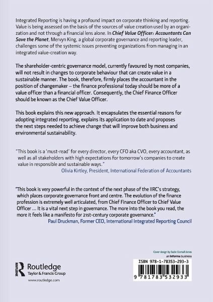 A brand new book, 'Chief Value Officer: Accountants Can Save the Planet' by Mervyn King with Jill Atkins (Greenleaf Publishing, December 2016), radically redefines the role of accountants.... This book is a rich source for the Globethics.net Ethics in Higher Education programme, demonstrating as it does how professions must and can be transformed into professions that create long term value for society. What is true for accountants, is true for engineers, economists, architects, doctors, and so on. - GlobalEthics.net Book review: Chief Value Officer - Accountants Can Save The Planet Certainly anyone interested in the communication of business information, in the widest sense, or who works in the field professionally, would benefit from reading this book.Currently, too much corporate information is given in coded, and often impenetrable, language that's designed to meet the letter rather than the spirit of regulatory requirements.It would be refreshing if corporate performance were to begin being communicated in a way in which the layman could understand it.Perhaps integrated reporting is a step along the way; and the CVO acronym will one day become as well-known as CFO and COO, on the seas of the Pythons' mythical wide Accountancy. - International Investment - Gerry Brown