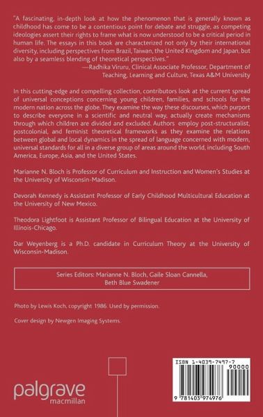 Preface; E.Swadener, G.Cannella & M.Bloch Foreword; T.S.Popkewitz PART I: THE CHILD IN THE WORLD/THE WORLD IN THE CHILD Education and the Configuration of a Universal, Modern, and Globalized Childhood: An Introduction; M.Bloch, D.Kennedy, T.Lightfoot & D.Weyenberg PART II: GOVERNING THE UNIVERSA, MODERN CHILD AND FAMILY Educational Theories and Pedagogies as Technologies of Power/Knowledge: Educating the Young Child as a Citizen of an Imagined Nation and World; M.Bloch Configuring the Jewish Child: Intersections of Pedagogy and Cultural Identity; D.Kennedy The Construction of the Asian American Children as "Model" Students; S.M.Adler PART III: GOVERNING THE MODERN AND NORMAL CHILD THROUGH PEDAGOGICAL DISCOURSES Constructing the Young Child as a "Productive Citizen" through Language Acquisition Theory; T.Lightfoot The Quest for Health in Different Timespaces; D.Weyenberg Visual Images and the Construction of Childhood Cultural Stories; N.Pauly The System of Reasoning the Child in Contemporary Japan; J.Qi The Specter of Irregularity Haunts the Child: A Historical Study of the "Problem-Child" in Brazilian Educational Discourses; A.L.G.Lima PART IV: GOVERNING THE MODERN AND POST-MODERN CITIZEN AND NATION THROUGH UNIVERSAL REFORMS IN EDUCATION No Child Left Behind? The Specters of Almsgiving and Atonement: A Short Genealogy of the Saving Grace of US Education; K.S.Pena Illusions of Social Democracy: Early Childhood Educational Voucher Policies in Taiwan; I.F.Lee The Foundation Stage Child in a Shifting Sea: A History of the Present of the United Kingdom's Education Act 2002; R.L.Peach