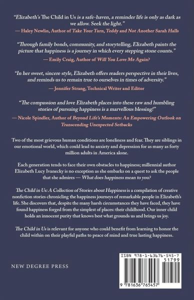 Two of the most grievous human conditions are loneliness and fear. They are siblings in our emotional world, which could lead to anxiety and depression for as many as forty million adults in America alone. Each generation tends to face their own obstacles to happiness; millennial author, Elizabeth Lucy Ivanecky is no exception as she embarks on a quest to ask the people that she admires - What does happiness mean to you? The Child in Us: A Collection of Stories about Happiness is a compilation of creative nonfiction stories chronicling the happiness journeys of remarkable people in Elizabeth's life. She discovers that, despite the many harsh circumstances they have faced, they have found happiness forged from the simplest of places: their childhood. Our inner child holds an innocent purity that knows best what grounds us and brings us joy. The Child in Us is relevant for anyone who could benefit from learning to honor the child within on their playful paths to peace of mind and true lasting happiness.