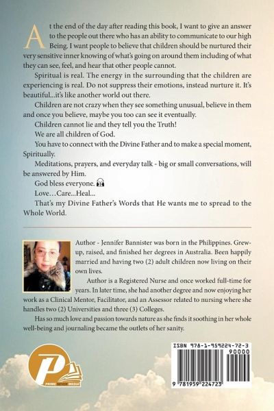 At the end of the day after reading this book, I want to give an answer to the people out there who has an ability to communicate to our high Being. I want people to believe that children should be nurtured their very sensitive inner knowing of what's going on around them including of what they can see, feel, and hear that other people cannot. Spiritual is real. The energy in the surrounding that the children are experiencing is real. Do not suppress their emotions, instead nurture it. It's beautiful...it's like another world out there. Children are not crazy when they see something unusual, believe in them and once you believe, maybe you too can see it eventually. Children cannot lie and they tell you the Truth! We are all children of God. You have to connect with the Divine Father and to make a special moment, Spiritually. Meditations, prayers, and everyday talk - big or small conversations, will be answered by Him. God bless everyone. ¿¿¿¿ Love...Care...Heal... That's my Divine Father's Words that He wants me to spread to the Whole World.