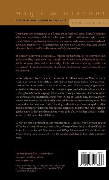 the early seventeenth century, thousands of children in Spain's Navarre region claimed to have been bewitched. The Child Witches of Olague features the legal depositions of self-described child witches as well as their parents and victims. The volume sheds new light on Navarre's massive witch persecution (1608-14), illuminating the tragic cost of witch hunts and opening a new window onto our understanding of early modern Iberian life. Drawing from Spanish-language sources only recently discovered, Homza translates and annotates three court cases from Olague in 1611 and 1612. Two were defamation trials involving the slur "witch," and the third was a petition for divorce filed by an accused witch and wife. These cases give readers rare access to the voices of illiterate children in the early modern period. They also speak to the emotions of witch-hunting, with testimony about enraged, terrified parents turning to vigilante justice against neighbors. Together the cases highlight gender norms of the time, the profound honor code of early modern Navarre, and the power of children to alter adult lives. With translations of Inquisition correspondence and printed pamphlets added for context, The Child Witches of Olague offers a portrait of witch-hunting as a horrific, contagious process that fractured communities. This riveting, one-of-a-kind book will appeal to anyone interested in the history of witch hunts, life in early modern Spain, and history as revealed through court testimony.