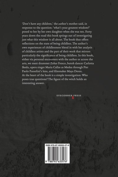 'Don't have any children,' the author's mother said, in response to the question: 'what's your greatest wisdom?' posed to her by her own daughter when she was 10. Forty years down the road this book springs out of investigating just what this wisdom is all about. The book thus offers reflections on the state of being childless. The author's own experiences of childlessness blend in with her analysis of childless artists and the part of their work that mirrors particularly the significance of being childless. In this book, either via personal encounters with the author or across the arts, we meet drummer Zohar Fresco, butoh dancer Carlotta Ikeda, opera singer Maria Callas as Medea through Pier Paolo Passolini's lens, and filmmaker Maya Deren. At the heart of the book is a simple investigation: Who poses true questions? The figure of the witch holds an interesting answer.