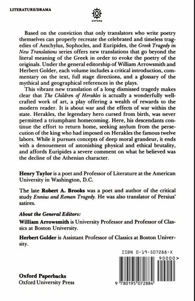 One of the shortest plays in Greek drama, The Children of Herakles offers enough action for two or three plays of normal length. But this very richness and complexity have made the play elusive, subject to dismissive readings, and extraordinarily difficult to translate; in consequence, it has suffered from neglect over the ages. This vibrant new translation makes clear that The Children of Herakles is actually a wonderfully well-crafted work of art, a play offering a wealth of rewards to the modern reader. It is a play about war and the effects of war within the state. Herakles, the legendary hero cursed from birth, was never permitted a triumphant homecoming. Here, his descendants continue the effort to return home, seeking asylum from the persecution of the king who had imposed on Herakles the famous twelve labors. While it pursues concepts of deep moral grandeur, it ends with a denouement of astonishing physical and ethical brutality, and affords Euripides a severe comment on what he believed was the decline of the Athenian character.