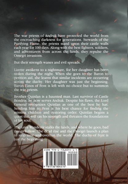 FEAR NO DARKNESS! The War Priests have defended the world against the vile Omegri for generations. Staunch defenders of the Purifying Flame, the lone light capable of preventing the darkness from creeping in, they stand the watch for 100 days each year. It is the Burning Season. A time of strife where their power is sorely tested and there are constant dangers let loose in the world. In the Duchy of Fent the Grey Wanderer has been spotted moving through the mist. Where he goes, bad things follow. Children soon begin to disappear. Whispers of the dead returned to life spread. The Baron is beset by evil and forced to turn to Castle Andrak for aid. Brother Quinlan and his squire are deployed to Fent in the hopes of solving the mystery of the missing children and stopping the evil from spreading. What he discovers stretches him to the edge of sanity, for evil is never satisfied. The Omegri will have this world and all within it should the War Priests fall. The Children of Never is the follow on novel to the L Ron Hubbard Writer's of the Future Contest 4th place winner The Purifying Flame.