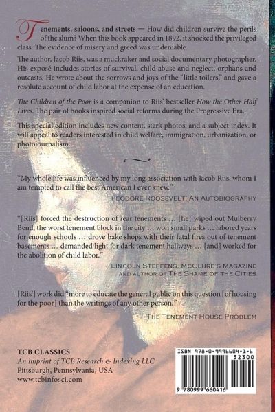 Tenements, saloons, and streets — How did children survive the perils of New York City slums? When this book appeared in 1892, it shocked the privileged class. The evidence of misery and greed was undeniable. The author, Jacob Riis, was a muckraker and social documentary photographer. His exposé includes stories of survival, child abuse and neglect, orphans and outcasts. He wrote about the sorrows and joys of the "¿little toilers," and gave a resolute account of child labor at the expense of an education. The Children of the Poor is a companion to Riis' bestseller How the Other Half Lives. His books inspired social reforms during the Progressive Era. This special edition includes new content, stark photos, and an in-depth subject index. It will appeal to readers interested in the history of child welfare, immigration, urbanization, or photojournalism. Beautiful design, sturdy binding, acid-free paper, subject index. Suitable for students and general readers.