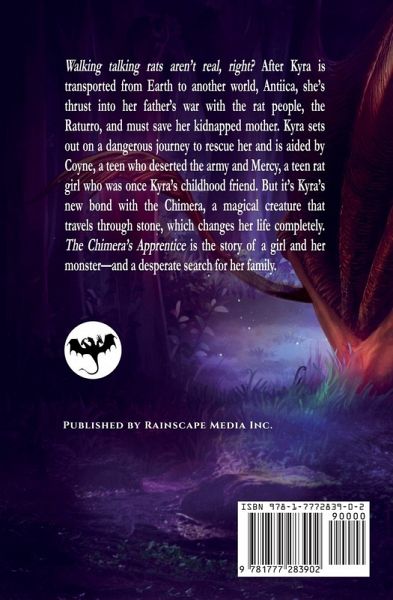 On the eve of her thirteenth birthday, Kyra Murch receives a strange stone bracelet from her mother, Aerrika. It's supposed to protect her - but from what? In the laundry room of her run-down apartment building, Kyra soon finds out. A mysterious walking, talking rat-man - a Raturro - tries to kidnap her. She stands up to the strange creature, Shale from Deep Nestling. Shale warns her she's in grave danger. She is rescued by the Chimera, a mythical creature made of light that travels through stone and is a portal to another world. Kyra keeps the terrifying encounter a secret, leaving her mother alone and helpless when the Raturro return to capture her. As Kyra surveys the devastation in her apartment, she faces another shock - the unexpected presence of her father Jaag, who has been absent from her life for years. Jaag uses the Chimera portal to bring Kyra to the land of Antiica, where a war is being waged against the vicious rebel rats and their leader, Majellan. And it's up to Kyra, the now-returned heir, to fulfil the prophecy and save the people and the Raturro from slavery and war. For a sheltered, solitary girl from Earth, this is a lot to ask. But she won't be alone. She befriends Coyne, a human teenager who has deserted from Jaag's army, and rescues Mercy, an enslaved teenaged Raturro who was once her childhood friend. Together they undertake the dangerous journey to rescue Aerrika from the rebel's stronghold--Thane's Reach. Will Kyra learn how to call the mysterious Chimera to her bidding? Will the deal she makes with the giant crows, the Corvie, prove impossible to fulfil? And most importantly, will she rescue her mother in time? The Chimera's Apprentice transports a character - and a reader - to a unique and magical world of adventure. The book builds a realm that is wholly believable and a heroine that is convincing and compelling, around the universal desire to hold a family together. The Chimera's Apprentice is a middle grade reader with a strong female protagonist on an adventure where friendships are forged and challenged. It's an unforgettable coming of age story that will inspire imagination in readers of all ages.