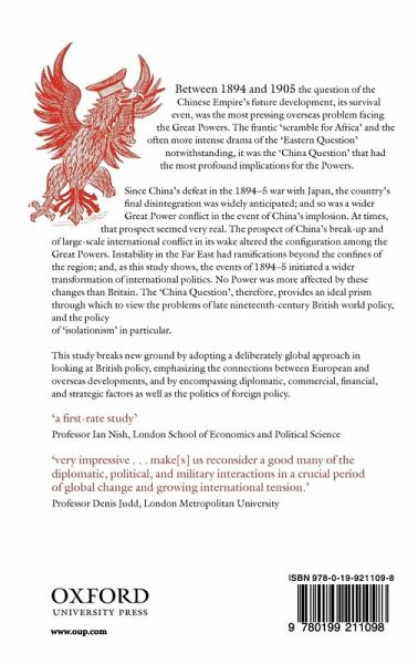 Between 1894 and 1905 the question of the Chinese Empire's future development, its survival even, was the most pressing overseas problem facing the Great Powers. The frantic 'scramble for Africa' and the often more intense drama of the 'Eastern Question' notwithstanding, it was the 'China Question' that had the most profound implications for the Powers. Since China's defeat in the 1894-5 war with Japan, the country's final disintegration was widely anticipated; and so was a wider Great Power conflict in the event of China's implosion. At times, that prospect seemed very real. The prospect of China's break-up and of large-scale international conflict in its wake altered the configuration among the Great Powers. Instability in the Far East had ramifications beyond the confines of the region; and, as this study shows, the events of 1894-5 initiated a wider transformation of international politics. No Power was more affected by these changes than Britain. The 'China Question', therefore, provides an ideal prism through which to view the problems of late nineteenth-century British world policy, and the policy of 'isolationism' in particular. This study breaks new ground by adopting a deliberately global approach in looking at British policy, emphasizing the connections between European and overseas developments, and by encompassing diplomatic, commercial, financial, and strategic factors as well as the politics of foreign policy.