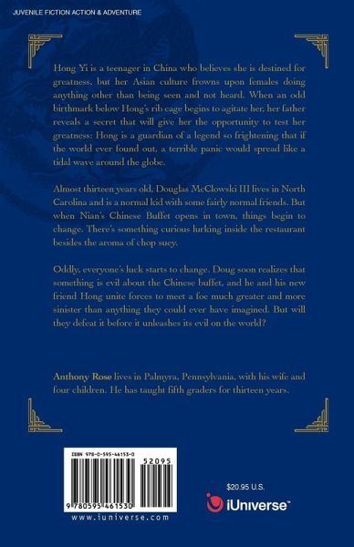 Hong Yi is a teenager in China who believes she is destined for greatness, but her Asian culture frowns upon females doing anything other than being seen and not heard. When an odd birthmark below Hong's rib cage begins to agitate her, her father reveals a secret that will give her the opportunity to test her greatness: Hong is a guardian of a legend so frightening that if the world ever found out, a terrible panic would spread like a tidal wave around the globe. Almost thirteen years old, Douglas McClowski III lives in North Carolina and is a normal kid with some fairly normal friends. But when Nian's Chinese Buffet opens in town, things begin to change. There's something curious lurking inside the restaurant besides the aroma of chop suey. Oddly, everyone's luck starts to change. Doug soon realizes that something is evil about the Chinese buffet, and he and his new friend Hong unite forces to meet a foe much greater and more sinister than anything they could ever have imagined. But will they defeat it before it unleashes its evil on the world?
