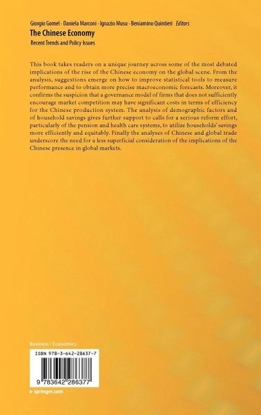 This book takes readers on a unique journey across some of the most debated implications of the rise of the Chinese economy on the global scene. From the analysis, suggestions emerge on how to improve statistical tools to measure performance and to obtain more precise macroeconomic forecasts. Moreover, it confirms the suspicion that a governance model of firms that does not sufficiently encourage market competition may have significant costs in terms of efficiency for the Chinese production system. The analysis of demographic factors and of household savings gives further support to calls for a serious reform effort, particularly of the pension and health care systems, to utilize households' savings more efficiently and equitably. Finally the analyses of Chinese and global trade underscore the need for a less superficial consideration of the implications of the Chinese presence in global markets.