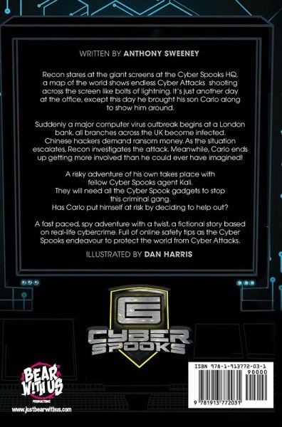 A day in the life of a cyber squad with the FIRST book in the action packed full-colour illustrated series, Cyber SpooksA cyber spy adventure story for kids 8 -12 A story book with wonderful illustrations and a FREE downloadable Online Safety ebook. A fun way to learn about cyber security Recon, the Cyber Spooks top agent, stares at the giant screens at the Cyber Spooks HQ, a map of the world shows endless cyber attacks shooting across the screen like bolts of lightning. It's just another day at the office, except this day he brought his 13 years old son Carlo along to show him around. Suddenly, a major computer virus outbreak begins in London. As one of the amazon reviewers put it.. 'An exciting adventure commences as Carlo tags along to his Dad's workplace for the day. Of course a massive hack begins pretty much as soon as Carlo gets there, so his Dad leaves Carlo under the supervision of his colleague, Naomi. Later, Naomi also gets called into action, and despite Carlo's promise to remain in the car, he finds a way to get in on the action.' A fast-paced, spy adventure with a twist, a fictional story based on real-life cybercrime. Full of online safety tips as the Cyber Spooks endeavour to protect the world from Cyber Attacks .Gain an insight into:Cyber Security Internet Safety Hackers Secret Agents ¿¿¿ Ideal for boys and girls 8-12A visually stunning and gripping storyline that will keep you entertained.