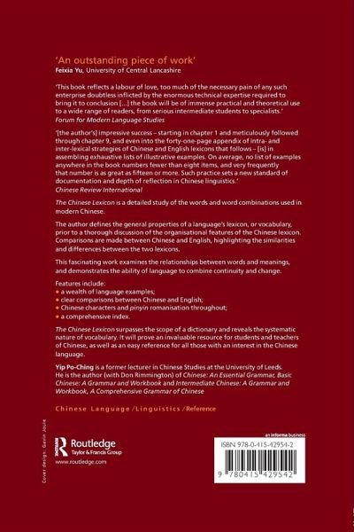 The Chinese Lexicon is a detailed study of the words and word combinations used in modern Chinese. Yip Po-Ching defines the general properties of a language's lexicon, or vocabulary, prior to a thorough discussion of the organizational features of the Chinese lexicon. Comparisons are made between Chinese and English, highlighting the similarities and differences between the two lexicons.