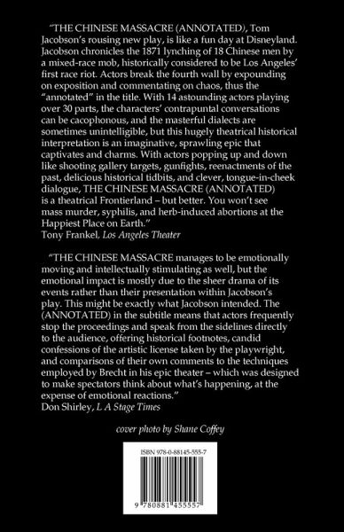 Based on historical incident, the play chronicles the first race riot in Los Angeles history: the 1871 lynching of 18 Chinese men by a mob of 500 "people from all nations." Tom Jacobson's fiercely theatrical retelling brings to light the remarkable, culturally diverse 19th-century Wild West town that exploded into the metropolis we know today. "THE CHINESE MASSACRE (ANNOTATED), Tom Jacobson's rousing new play, is like a fun day at Disneyland. Jacobson chronicles the 1871 lynching of 18 Chinese men by a mixed-race mob, historically considered to be Los Angeles's first race riot. Actors break the fourth wall by expounding on exposition and commentating on chaos, thus the 'annotated' in the title. With 14 astounding actors playing over 30 parts, the characters' contrapuntal conversations can be cacophonous, and the masterful dialects are sometimes unintelligible, but this hugely theatrical historical interpretation is an imaginative, sprawling epic that captivates and charms. With actors popping up and down like shooting gallery targets, gunfights, reenactments of the past, delicious historical tidbits, and clever, tongue-in-cheek dialogue, THE CHINESE MASSACRE (ANNOTATED) is a theatrical Frontierland - but better. You won't see mass murder, syphilis, and herb-induced abortions at the Happiest Place on Earth." -Tony Frankel, Los Angeles Theater "THE CHINESE MASSACRE manages to be emotionally moving and intellectually stimulating as well, but the emotional impact is mostly due to the sheer drama of its events rather than their presentation within Jacobson's play. This might be exactly what Jacobson intended. The (ANNOTATED) in the subtitle means that actors frequently stop the proceedings and speak from the sidelines directly to the audience, offering historical footnotes, candid confessions of the artistic license taken by the playwright, and comparisons of their own comments to the techniques employed by Brecht in his epic theater - which was designed to make spectators think about what's happening, at the expense of emotional reactions." -Don Shirley, L A Stage Times "THE CHINESE MASSACRE is a prodigiously researched, self-consciously Brechtian parable about what may be L A's first officially recorded race riot in 1871. A number of 'annotators' playfully interrupt the action to identify historical inaccuracies that have been interjected for the flow of the story - and, citing Brecht's style of epic theater, to prevent the play's larger ideas from being overpowered by our emotional reaction to various lynchings and other brutalities depicted on the stage. Those ideas swirl around the essences of ethnic bigotry that just seem to keep recycling themselves, like our race riots, as the decades roll by." -Steven Leigh Morris, L A Weekly