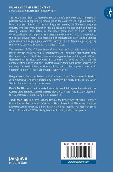 The recent and dramatic development of China's economy and international political muscle is especially pronounced in the country's video game industry. Now the largest of its kind in the world by gross revenue, the Chinese video game industry impacts every player in the global game market and has begun to directly influence the nature of the video game medium itself. From its conceptualization of the player as a category and commodity, to its approach to the design, development, and marketing of products and services, the Chinese game industry is engaging in a complex, innovative, and fascinating reimagining of the video game as a cultural and industrial force.