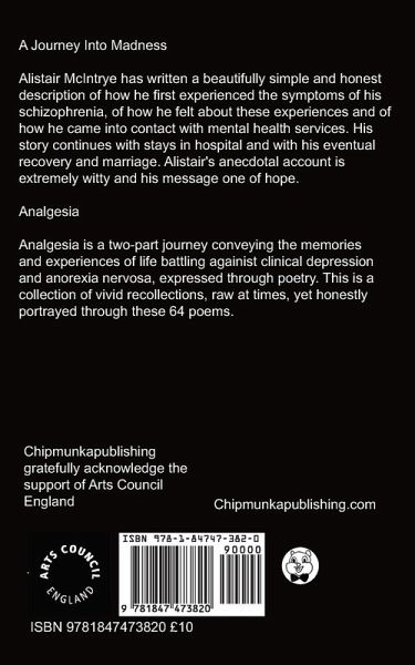 p>Volume Two of the Chipmunka Anthology contains four stories very different by equally inspiring stories of mental health empowerment. It includes: Description: A journey into madness Alistair McIntrye has written a beautifully simple and honest description of how he first experienced the symptoms of his schizophrenia, of how he felt about these experiences and of how he came into contact with mental health services. His story continues with stays in hospital and with his eventual recovery and marriage. Alistair's anecdotal account is extremely witty and his message one of hope. "I wrote this story of mine so people could have some insight into what thoughts, feelings and experiences a person has when they develop schizophrenia."-Alistair McIntyre EXTRACT Description: Analgesia Analgesia is a two-part journey conveying the memories and experiences of life battling againist clinical depression and anorexia nervosa, expressed through poetry. This is a collection of vivid recollections, raw at times, yet honestly portrayed through these 64 poems. EXTRACT