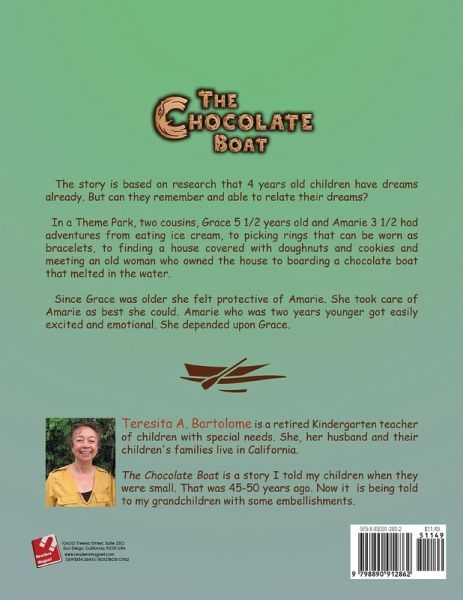 Teresita A. Bartolome is a retired Kindergarten teacher of children with special needs. She, her husband and their children's families live in California.The Chocolate Boat is a story I told my children when they were small. That was 45-50 years ago. Now it is being told to my grandchildren with some embellishments.