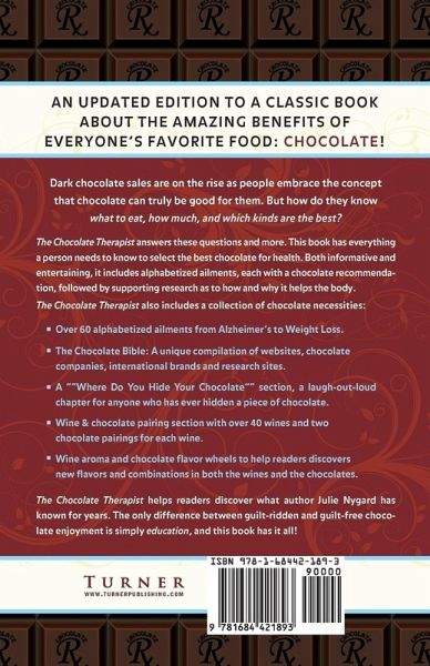 An updated edition to a classic book about the amazing benefits of everyone's favorite food: Chocolate! Dark chocolate sales are on the rise as people embrace the concept that chocolate can truly be good for them. But how do they know what to eat, how much, and which kinds are the best? The Chocolate Therapist answers these questions and more. This book has everything a person needs to know to select the best chocolate for health. Both informative and entertaining, it includes alphabetized ailments, each with a chocolate recommendation, followed by supporting research as to how and why it helps the body. The Chocolate Therapist also includes a collection of chocolate necessities:Wine & chocolate pairing section with over 40 wines and three chocolate pairings for each wine.Wine aroma and chocolate flavor wheels to help readers discovers new flavors and combinations in both the wines and the chocolates.The Chocolate Bible: A unique compilation of websites, chocolate companies, international brands and research sites.A""Where Do You Hide Your Chocolate"" section, a laugh-out-loud chapter for anyone who has ever hidden a piece of chocolateOver 60 alphabetized ailments from Alzheimer's to Weight Loss The Chocolate Therapist helps readers discover what author Julie Nygard has known for years. The only difference between guilt-ridden and guilt-free chocolate enjoyment is simply education, and this book has it all!