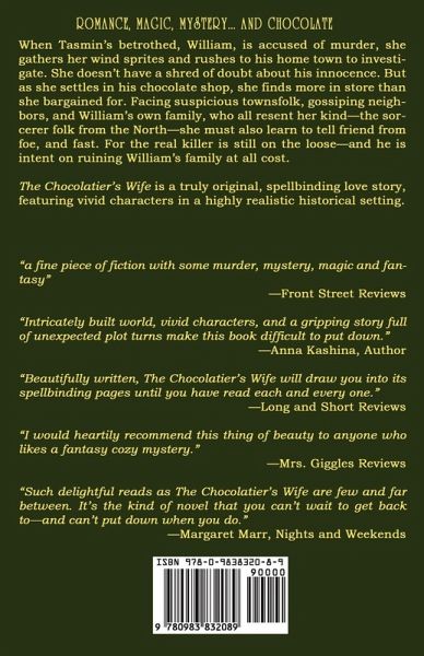 ROMANCE, MAGIC, MYSTERY.... AND CHOCOLATE A truly original, spellbinding love story, featuring vivid characters in a highly realistic historical setting. When Tasmin's bethrothed, William, is accused of murder, she gathers her wind sprites and rushes to his home town to investigate. She doesn't have a shred of doubt about his innocence. But as she settles in his chocolate shop, she finds more in store than she bargained for. Facing suspicious townsfolk, gossiping neighbors, and William's own family, who all resent her kind - the sorcerer folk from the North -- she must also learn to tell friend from foe, and fast. For the real killer is still on the loose - and he is intent on ruining William's family at all cost.