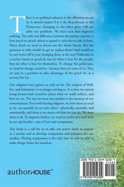 There is no political solution to the dilemma we are in. It doesn't matter if it is the Republicans or the Democrats, changing to the other party will not solve our problems. We have seen that improves nothing. The only real difference between the parties, anyway, is how much to spend, where to spend it, and who to take it from. Many think we need to throw out the whole bunch. But the question is: who would we get to replace them? And would we be any better off by just changing those at the top? Politicians in a society based on greed do not do what is best for the people; they do what is best for themselves. To change the politicians, we need to change ourselves-because they are some of us. They are just in a position to take advantage of the greed we, as a society, live by. Our religions have gotten us only so far. The religion of Hell, fire, and brimstone, is no longer serving us. It is time we started being honest with ourselves about what we really believe, and how we act. The way we treat one another is the measure of our consciousness. Even with having religions, we have been as cruel as we can possibly be to each other-physically, mentally, and emotionally, and there is no more evil that we can do. We have done it all. To improve further, we need to evolve to a new level in our spirituality---one of love and compassion. This book is a call for us to take our power back, to mature as a society, and to develop compassion and tolerance for one another. Having compassion is the only way we will be able to make things better for ourselves.
