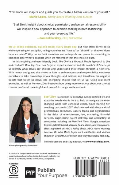 We all make decisions, big and small, every single day. But how often do we do so while operating on autopilot, telling ourselves we "have to" or "should," or that we "don't have a choice?" Why do we limit ourselves and relinquish our power to something or someone else? What's possible when we remember that the choice is ours?In this inspiring and user-friendly book, The Choice Is Yours: A Simple Approach to Live and Lead with More Joy, Ease, and Purpose, expert executive and life coach Stef Ziev helps us identify what drives our choices and understand their impact through a new lens. With humor and grace, she shows us how to embrace personal responsibility, empower ourselves to take ownership of our thoughts and actions, and transform the negative beliefs that weigh us down into energizing choices that lift us up. Using real client examples, as well as her own, Ziev illustrates how being more conscious about our choices creates profound, meaningful, and powerful change inside and out. Ziev offers a straightforward and proven approach to help us recognize our triggers, release our blocks, and make decisions that are aligned with the truth of who we are and what we really want. She reminds us that whatever challenges we face, we all have the authority to choose our responses and curate the direction and quality of our lives and leadership. Ziev provides practical tools and reflection exercises that support us to bring more intention to the choices we make, so that we have more power over the results we create. Isn't it time to take a stand and choose to live and lead with more joy, ease, and purpose? The choice is yours.