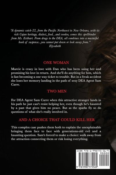 One Woman... Marcie is crazy in love with Dan who has been using her and promising his love in return. And she'll do anything for him, which is fast becoming a one way ticket to trouble. But in a freak accident she loses her memory landing in the path of sexy DEA Agent Sam Carre. Two Men... For DEA Agent Sam Carre when this attractive stranger lands in his path he just can't resist helping her, even though he's haunted by a past that gives him no peace. But as the sparks fly so do questions of what she's really involved in. And a choice that could kill her... This complex case pushes them both to explain the unexplainable bringing them face to face with generations-old evil and a haunting question. Sam's forced to make a choice: walk away from the attraction connecting them or risk losing everything.