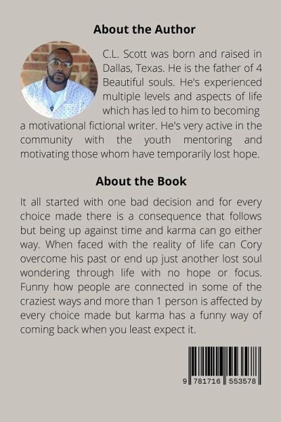 It all started with one bad decision and for every choice made there is a consequence that follows but being up against time and karma can go either way. When faced with the reality of life can Cory overcome his past or end up just another lost soul wondering through life with no hope or focus. Funny how people are connected in some of the craziest ways and more than 1 person is affected by every choice made but karma has a funny way of coming back when you least expect it.