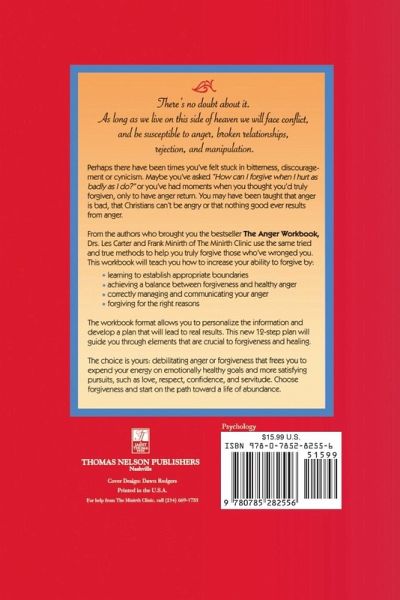 Discover Contentment and Peace by Letting Go of Harmful Anger Perhaps there have been times you've felt stuck in bitterness, discouragement or cynicism. Maybe you've asked "How can I forgive when I hurt as badly as I do?" or you've had moments when you thought you'd truly forgiven, only to have anger return. You may have been taught that anger is bad, that Christians can't be angry or that nothing good ever results from anger. From the authors who brought you the bestseller The Anger Workbook, Dr. Les Carter and Frank Minirth of The Minirth Clinic use the same tried and true methods to help you truly forgive those who've wronged you. This 12-part comprehensive plan will teach you how to increase your ability to forgive and find lasting healing by: learning to establish appropriate boundaries achieving a balance between forgiveness and healthy anger correctly managing and communicating your anger forgiving for the right reasons The workbook format allows you to personalize the information and develop a plan that will lead to real results. This new 12-step plan will guide you through elements that are crucial to forgiveness and healing. The choice is yours: debilitating anger or forgiveness that frees you to expend your energy on emotionally healthy goals and more satisfying pursuits, such as love, respect, confidence, and servitude. Choose forgiveness and start on the path toward a life of abundance.