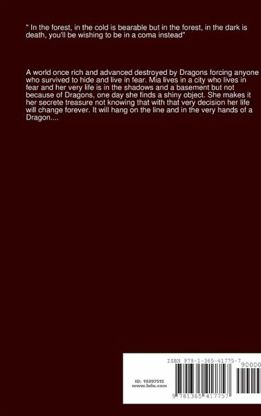 A world once rich and advanced destroyed by Dragons forcing anyone who survived to hide and live in fear. Mia lives in a city who lives in fear and her very life is in the shadows and a basement but not because of Dragons, one day she finds a shiny object. She makes it her secrete treasure not knowing that with that very decision her life will change forever. It will hang on the line and in the very hands of a Dragon....