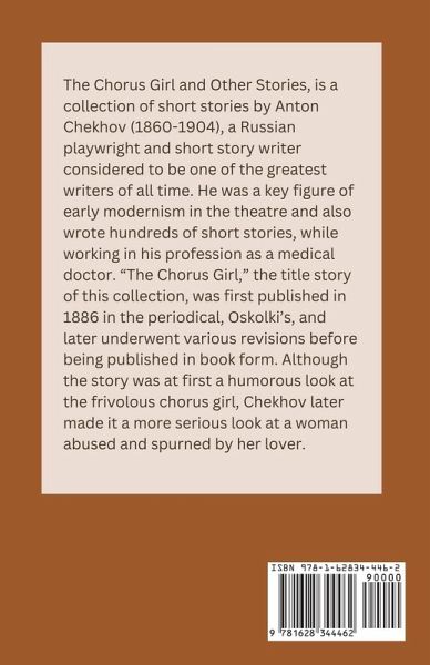 Unique Elements * About the Author * About the Translator * A Literary Classic by ANTON CHEKHOV. The Chorus Girl and Other Stories by RUSSIAN author ANTON CHEKHOV is a collection of short stories first published in 1920 in the UNITED KINGDOM. The title story of this collection, "The Chorus Girl," tells the sad story of a woman spurned by her lover. Sneak Peak 'Kolpakov did not mind being found by the postman or Pasha's lady friends, but by way of precaution gathered up his clothes and went into the next room, while Pasha ran to open the door. To her great surprise in the doorway stood, not the postman and not a girl friend, but an unknown woman, young and beautiful, who was dressed like a lady, and from all outward signs was one.' Master Storyteller Anton Chekhov (1860-1904), a Russian playwright and short story writer, is regarded by some as one of the greatest. He was a key figure of early modernism in the theatre and also wrote hundreds of short stories, while working in his profession as a medical doctor. "The Chrous Girl," the title story of this collection, was first published n 1886 and later revised before appearing in book form. Title Details * Translation by Constance C. Garnett, 1920 * Short stories