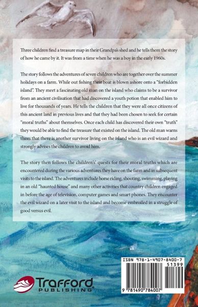 Three children find a treasure map in their Grandpa’s shed and he tells them the story of how he came by it. It was from a time when he was a boy in the early 1960s. The story follows the adventures of seven children who are together over the summer holidays on a farm. While out fishing their boat is blown ashore onto a "forbidden island". They meet a fascinating old man on the island who claims to be a survivor from an ancient civilisation that had discovered a youth potion that enabled him to live for thousands of years. He tells the children that they were all once citizens of this ancient land in previous lives and that they had been chosen to seek for certain "moral truths" about themselves. Once each child has discovered their own "truth" they would be able to find the treasure that existed on the island. The old man warns them that there is another survivor living on the island who is an evil wizard and strongly advises the children to avoid him. The story then follows the children’s’ quests for their moral truths which are encountered during the various adventures they have on the farm and in subsequent visits to the island. The adventures include horse riding, shooting, swimming, playing in an old "haunted house" and many other activities that country children engaged in before the age of television, computer games and smart phones. They encounter the evil wizard on a later visit to the island and become embroiled in a struggle of good versus evil.