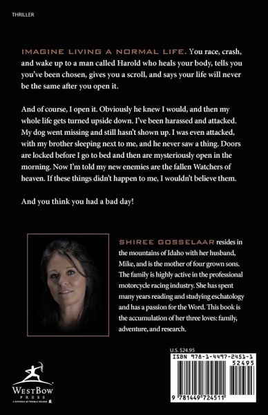 Imagine living a normal life. You race, crash, and wake up to a man called Harold who heals your body, tells you you've been chosen, gives you a scroll, and says your life will never be the same after you open it. And of course, I open it. Obviously he knew I would, and then my whole life gets turned upside down. I've been harassed and attacked. My dog went missing and still hasn't shown up. I was even attacked, with my brother sleeping next to me, and he never saw a thing. Doors are locked before I go to bed and then are mysteriously open in the morning. Now I'm told my new enimies are the fallen Watchers of heaven. If these things didn't happen to me, I wouldn't believe them. And you think you had a bad day!