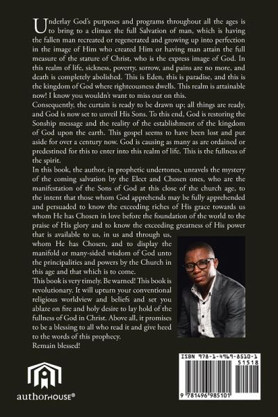 Underlay God's purposes and programs throughout all the ages is to bring to a climax the full Salvation of man, which is having the fallen man recreated or regenerated and growing up into perfection in the image of Him who created Him or having man attain the full measure of the stature of Christ, who is the express image of God. In this realm of life, sickness, poverty, sorrow, and pains are no more, and death is completely abolished. This is Eden, this is paradise, and this is the kingdom of God where righteousness dwells. This realm is attainable now! I know you wouldn't want to miss out on this. Consequently, the curtain is ready to be drawn up; all things are ready, and God is now set to unveil His Sons. To this end, God is restoring the Sonship message and the reality of the establishment of the kingdom of God upon the earth. This gospel seems to have been lost and put aside for over a century now. God is causing as many as are ordained or predestined for this to enter into this realm of life. This is the fullness of the spirit. In this book, the author, in prophetic undertones, unravels the mystery of the coming salvation by the Elect and Chosen ones, who are the manifestation of the Sons of God at this close of the church age, to the intent that those whom God apprehends may be fully apprehended and persuaded to know the exceeding riches of His grace towards us whom He has Chosen in love before the foundation of the world to the praise of His glory and to know the exceeding greatness of His power that is available to us, in us and through us, whom He has Chosen, and to display the manifold or many-sided wisdom of God unto the principalities and powers by the Church in this age and that which is to come. This book is very timely. Be warned! This book is revolutionary. It will upturn your conventional religious worldview and beliefs and set you ablaze on fire and holy desire to lay hold of the fullness of God in Christ. Above all, it promises to be a blessing to all who read it and give heed to the words of this prophecy. Remain blessed!