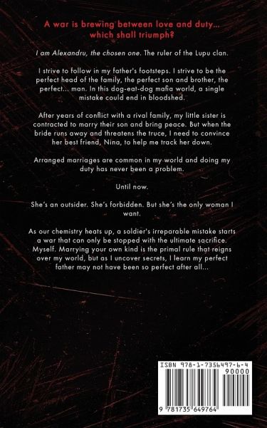 A war is brewing between love and duty...which shall triumph? I am Alexandru, the chosen one. The ruler of the Lupu clan. I strive to follow in my father's footsteps. I strive to be the perfect head of the family, the perfect son and brother, the perfect... man. In this dog-eat-dog mafia world, a single mistake could end in bloodshed. After years of conflict with a rival family, my little sister is contracted to marry their son and bring peace. But when the bride runs away and threatens the truce, I need to convince her best friend, Nina, to help me track her down. Arranged marriages are…mehr
