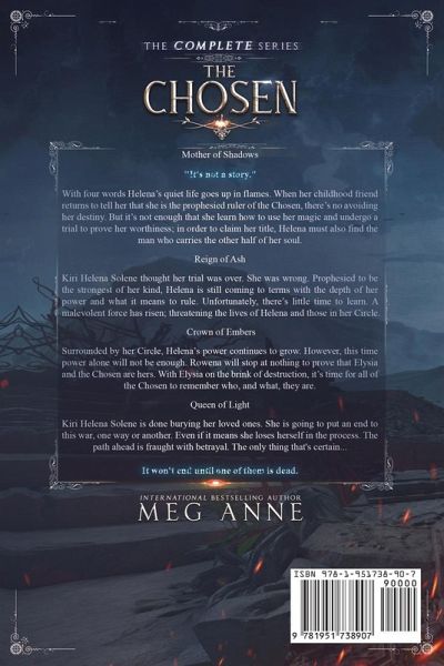 Mother of Shadows "It's not a story." With four words Helena’s quiet life goes up in flames. When her childhood friend returns to tell her that she is the prophesied ruler of the Chosen, there’s no avoiding her destiny. But it’s not enough that she learn how to use her magic and undergo a trial to prove her worthiness; in order to claim her title, Helena must also find the man who carries the other half of her soul. Reign of Ash Kiri Helena Solene thought her trial was over. She was wrong. Prophesied to be the strongest of her kind, Helena is still coming to terms with the depth of her power and what it means to rule. Unfortunately, there’s little time to learn. A malevolent force has risen; threatening the lives of Helena and those in her Circle. Crown of Embers Surrounded by her Circle, Helena’s power continues to grow. However, this time power alone will not be enough. Rowena will stop at nothing to prove that Elysia and the Chosen are hers. With Elysia on the brink of destruction, it’s time for all of the Chosen to remember who, and what, they are. Queen of Light Kiri Helena Solene is done burying her loved ones. She is going to put an end to this war, one way or another. Even if it means she loses herself in the process. The path ahead is fraught with betrayal. The only thing that's certain... It won't end until one of them is dead.