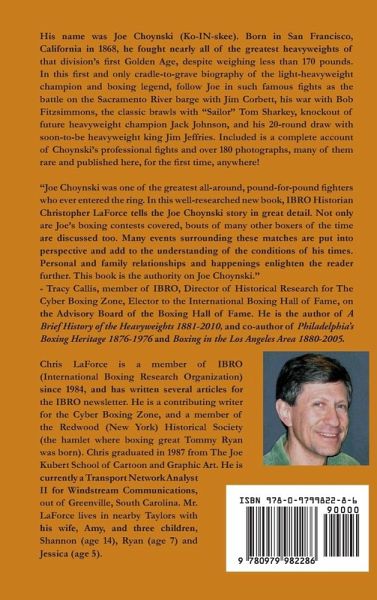 In this first and only biography of light-heavyweight champion and boxing legend Joe Choynski, author Chris LaForce chronicles the life and career of a pioneer of the gloved era of pugilism. Joe Choynski was one of the greatest, most courageous, brilliant, and respected Jewish boxers in history. Born in San Francisco, California in 1868, Joe Choynski fought nearly all of the greatest heavyweights of that division's first Golden Age, despite weighing less than 170 pounds. He was one of the few who did not draw the color line. Included is a complete account of Joe's professional fights. Come follow Choynski's boxing career in such legendary matches as the battle on the Sacramento River barge with "Gentleman" Jim Corbett, his war with Bob Fitzsimmons, the classic brawls with "Sailor" Tom Sharkey, knockout of future heavyweight champion Jack Johnson, and his 20-round draw with soon-to-be heavyweight king Jim Jeffries. This book features over 180 photographs, many of them rare and published here, for the first time, anywhere! The book includes a Foreword by Herbert G. Goldman, former Managing Editor of Ring magazine and Editor-in-Chief of Boxing Illustrated, and a testimonial by renowned boxing historian, Tracy Callis. Chris LaForce has been a member of IBRO (the International Boxing Research Organization) since 1984. He has written several articles for the IBRO newsletter, and is a contributing writer for the Cyber Boxing Zone, Western States Jewish History and other historical societies.