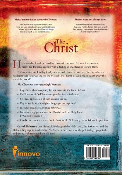 -About The Book: Jesus was either loved or hated by those with whom He came into contact; rarely did He leave anyone with a feeling of indifference toward Him. The authorities of His day finally renounced Him as a fake, but The Christ leaves no doubt that Jesus was indeed the Messiah, the "Lamb of God which taketh away the sin of the world." The Christ has many wonderful features: ¿ ¿ Organized chronologically by key events in the life of Christ ¿ Fulfillments of Old Testament prophecies are indicated ¿ Spiritual application of each event is shown ¿ Keywords from the original languages are explained ¿ Includes complete Scripture references ¿ Includes song lyrics about the Messiah and the Holy Land by Carroll Roberson ¿ Can be used as a reference book, devotional, Bible study, or individual inspiration -About The Author: Carroll Roberson uses his vast knowledge of the Holy Land, the Scriptures, and the Hebrew language to teach about The Christ in the context of the political, geographical, and spiritual climate in which He lived. Carroll is a full-time Southern Baptist Evangelist and President of Carroll Roberson Ministries, which consists of preaching the contextual, Jewish roots of the Christian faith, and recording inspirational, Christ-centered music. Carroll has led some three dozen tours to Israel and filmed several documentaries on the life of Christ in the Holy Land. He has authored many books, recorded 50 albums, and written over 300 songs, including twenty "Top 10s" and four #1 hits on the Christian music charts. Carroll and his wife, Donna, also host a worldwide television program. To learn more, download The Carroll Roberson Ministries free APP for your smartphone or streaming TV service (e.g., AppleTV, FireTV & Roku) or visit www.carrollroberson.com. -About the Publisher: Innovo Publishing LLC is a multimedia publisher located near Memphis, TN. Since 2008, Innovo has published quality books, eBooks, audiobooks, music, screenplays, and curricula for authors, artists, and organizations within Christian and wholesome markets. Innovo's capabilities and global reach provide authors, artists, and ministries access to the world for Christ. To learn more about Innovo Publishing, visit our website at innovopublishing.com. To connect with other Christian creatives and to learn best practices for creating, publishing, marketing, and selling Christian titles, visit the Christian Publishing Portal at cpportal.com.