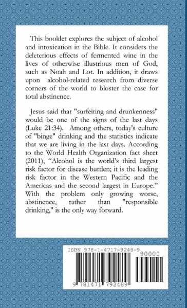 This booklet makes the case for total abstinence from within a biblical framework. It considers the intoxication of giants of the faith, such as Noah and Lot, and argues for a zero tolerance policy towards alcohol.It also draws upon alcohol-related research from across the world to bolster the case for abstinence.