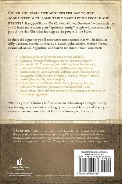 Could you spare five minutes per day to get acquainted with some truly fascinating people and events? If so, you'll love The Christian History Devotional, where each day you'll learn more about your "spiritual family," people who are as much a part of the rich Christian heritage as the people of the Bible. In these 365 vignettes you'll meet some names that will be familiar: Billy Graham, Martin Luther, C. S. Lewis, John Wesley, Mother Teresa, Francis of Assisi, Augustine, Corrie ten Boom. You'll also meet Christian athletes (Olympic runner Eric Liddell), scientists (George Washington Carver, Johannes Kepler), authors (G. K. Chesterton, John Milton, Anne Bradstreet), statesmen (William Gladstone, William Jennings Bryan), missionaries (Gladys Aylward, William Carey, Francis Xavier), evangelists (Billy Sunday, Dwight L. Moody, "Gypsy" Smith), artists (Rembrandt, Michelangelo), social reformers (William Wilberforce, Josephine Butler), soldiers ("Stonewall" Jackson, Oliver Cromwell), and many others, from the first century to the present, a diverse cast of truly amazing people. Turn to August 12, the day in 1973 when political "hatchet man" Chuck Colson gave his life to Christ. March 21, read about devout composer Johann Sebastian Bach, born on that date in 1685. April 1, learn about Communist-spy-turned-Christian Whittaker Chambers, born in 1901. October 15, meet evangelist Sam Jones, for whom the Ryman Auditorium (Grand Ole Opry) was built. October 31, discover what led Martin Luther to launch the Reformation in 1517. Whether you're a history buff or someone who always thought history was boring, here's a book to enlarge your spiritual family and teach you valuable lessons about life and faith. Here is history with a heart.