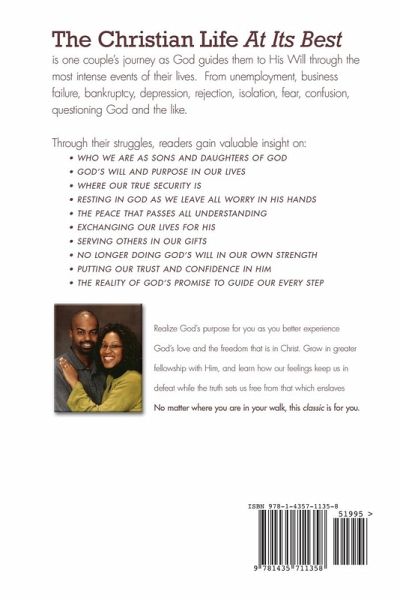 The Christian Life At Its Best is a memoir of one couple's journey as God guides them to His Will through the most intense events of their lives. From unemployment, business failure, bankruptcy, depression, rejection, isolation fear, confusion, questioning God and the like. Through their struggles, readers gain valuable insight on: God's Will and purpose in our lives Our true security; Resting in God as we leave all worry in His hands; The peace that passes all understanding; Exchanging our lives for His; Serving in our gifts; No longer doing God's Will in our own strength; Putting our trust and confidence in Him; The reality of God's promise to guide our every step; Realize God's purpose for you as you better experience God's love and the freedom that is in Christ. Grow in greater fellowship with Him, and learn how our feelings keep us in defeat while the truth sets us free from that which enslaves us. No matter where you are in your Christian life, this classic is for you.