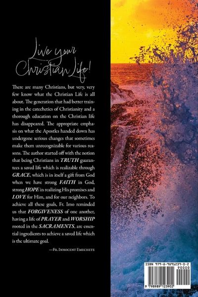 The book, The Christian Life, is a simplified Adult Catechism aimed at helping Adults who are preparing to embrace the Christian faith in Catholic Church. It begins by tracing the history of salvation wrought by Jesus Christ and the life he gives believers. The author believes that very few know what the Christian Life is all about. Who is to blame for this disconnect? The author discusses how the true concept of Christianity has been misunderstood. There are some misconceptions by which the term "Christian" is used today that are not at all consistent with what it means to be Christlike. It is for the above deficiencies in our practice of Christianity that the author wrote the book to help candidates for Confirmation and Adult Initiation. He broke it down to practicality of everyday life that everybody can understand and actualize. To make sure no one is tempted to call it his sentiment or opinion, he gave ample and robust quotations from the Word of God - THE BIBLE, to support every point. It states that Christianity is more of a religion of life than of prayer. This life is modeled on Jesus, who is the human personality of God who came to usher in the era of grace. As such, the Christian life entails following Jesus daily in his humility, grace, faith, love, forgiveness, and prayer. It is in this following of Jesus comes the name "Christian" (Acts 11:25-26). Jesus sets how to live this life by teachings that challenge the status quo. It is a life that is not ordinary, a life that calls for perspective change: love those who hate you (Lk 6:27), turn the other cheek (Mt 5:39), rejoice in your suffering, and "blessed" are the poor and the persecuted (Mt 5:3). Give not only your coat (Lk 3:11) but your very life (Mt. 16:25) for the sake of love. This straightforward, down-to-earth catechetical summary of the Christian Faith is an ideal read for every Christian and those who want to become one. It is not only foundational; it is also a refresher course in Christianity for adults in Christian programs. The author stumbled on it when he was faced with how to reach some people in his parish who were not in the parochial school catechetical program. He devised a gradual, step-by-step and comprehensive pedagogy online. It even grew bigger when the Covid-19 kept everybody locked down for about two years. So, it is in an effort to demonstrate that the Christian is called to a set lifestyle that comes from a belief in Christ that this book is written. It underscores that everything is not Christianity, and every life is not a Christian life. While there are many lifestyles, as there are many motivations and creeds, the Christian life is rich and unique. It is simple, noble, joyful, and rooted in the life of Christ. It is much more than honorific titles. Titles and hierarchies do not make a Christian.